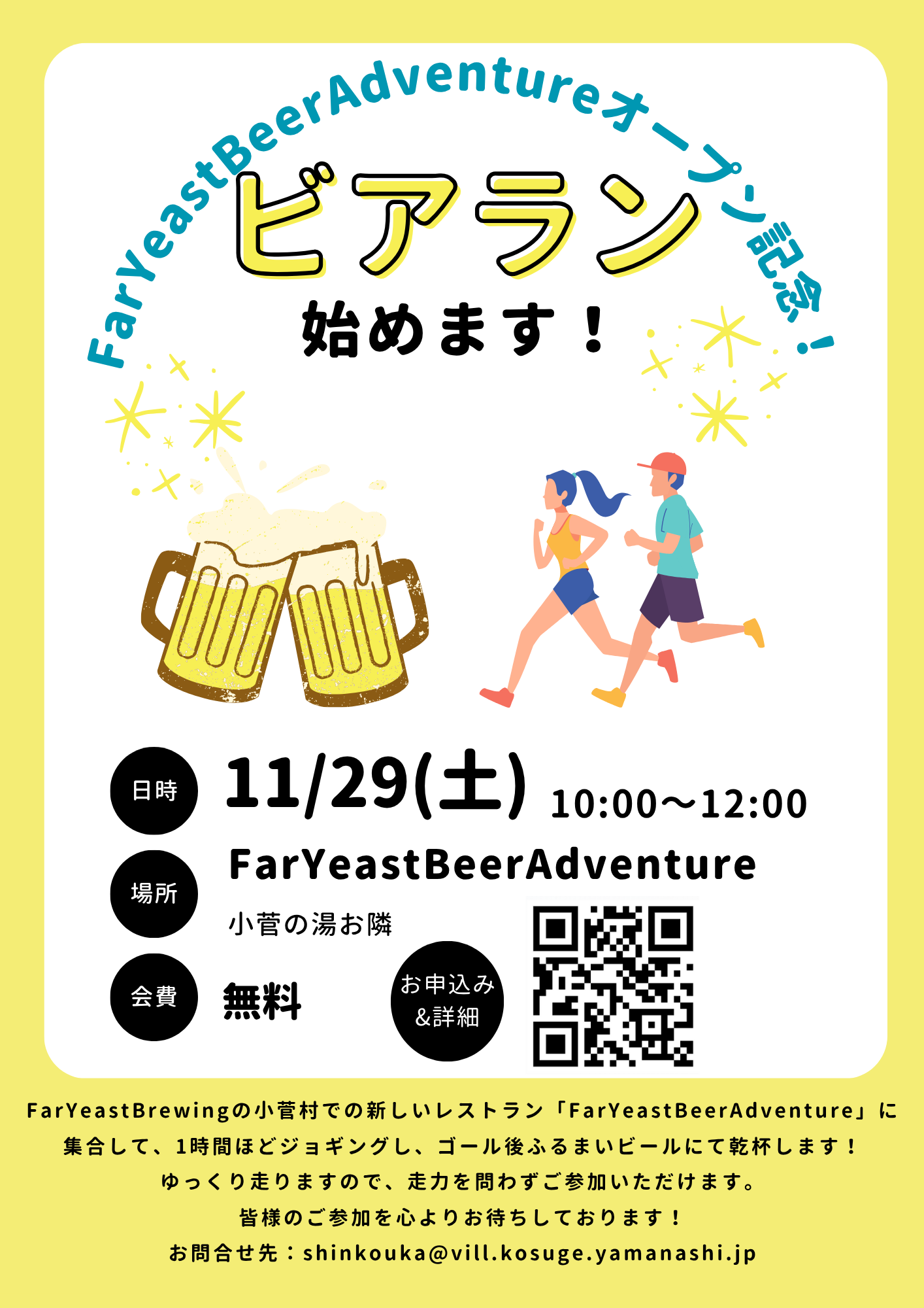 FarYeastBrewingが2025年11月に小菅村にオープンするレストラン「THE FAR YEAST Beer Adventure」を起点にしたビアランイベントを開催します。レストランをスタート・ゴールに、小菅村の見どころを巡りながら1時間ほど走り、ふるまいビールで乾杯するイベントです。ビールを愛する仲間と、楽しく走って乾杯しましょう!