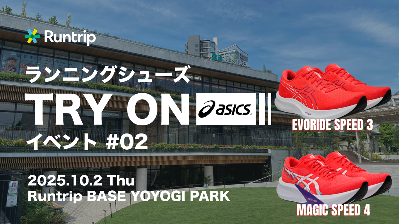 Runtrip BASE YOYOGI PARKを拠点にASICSの最新ランニングシューズをTry onできる体験イベント。ASICSのシューズの魅力や履きわけ方を体感いただける機会提供します
