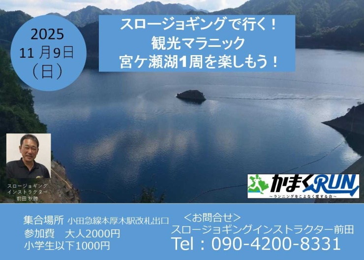 宮ヶ瀬湖(みやがせこ)は、神奈川県北西部の東丹沢にある宮ヶ瀬ダム建設によってできたダム湖である。神奈川県愛甲郡愛川町、同郡清川村、相模原市緑区の3市町村にまたがる。宮ヶ瀬ダムは中津川をせき止め2000年12月に完成したが、宮ヶ瀬湖自体は宮ヶ瀬ダム完成前の試験湛水によって1998年にできていた。宮ケ瀬湖をほぼ1週して行きます。1週は舗装されたロードのみで、急な上り坂はウォーキングで平坦な道はスロージョギングで進みます。途中500m毎に休憩を取り全員が無理なくゴール出来るようにします。