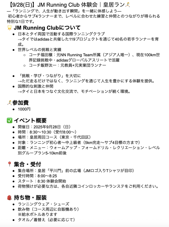 【JM Running Club体験会|10/5(日)皇居ラン】
