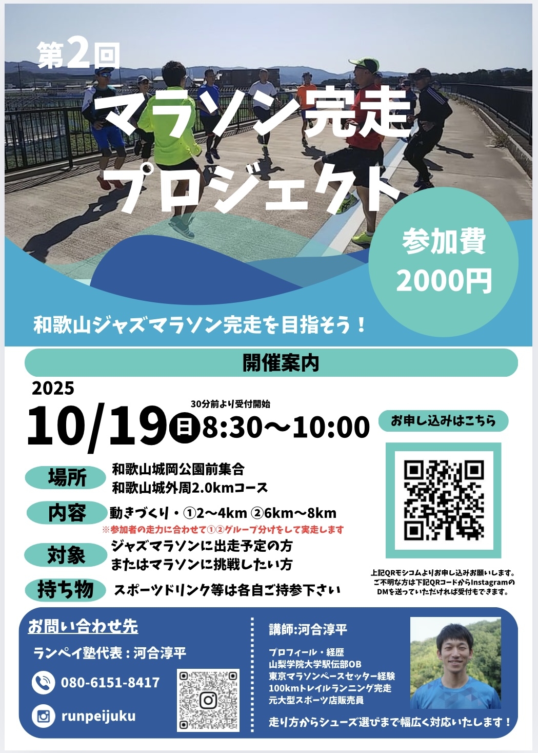 当日は和歌山ジャズマラソン(ハーフマラソン)完走目標を中心に指導いたします。