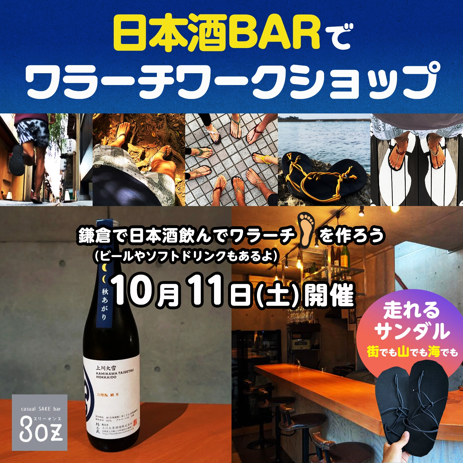【10月・鎌倉】日本酒BARでワラーチワークショップ開催!Casual Sake BAR 3oz 受付終了