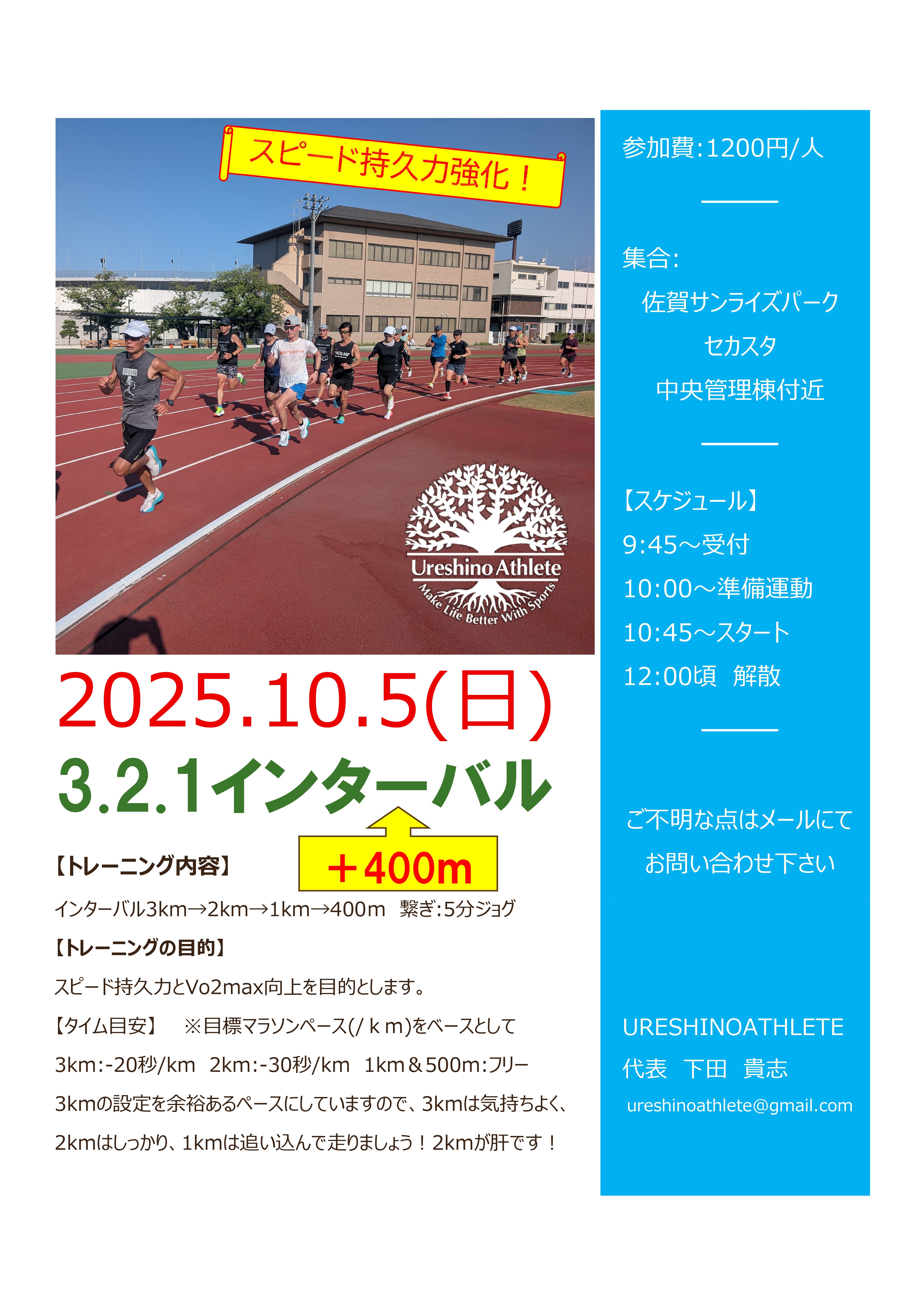 【ロードレースに向けたスピード練習】3.2.1インターバル+400m 受付終了