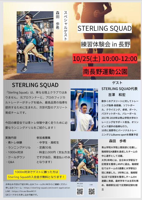 「Sterling Squad」は、単なる陸上クラブではありません。 元プロランナーと、プロのフィジカルトレーナーがタッグを組み、最高品質の指導を提供するために生まれた、次世代型のアスリート育成チームです。
