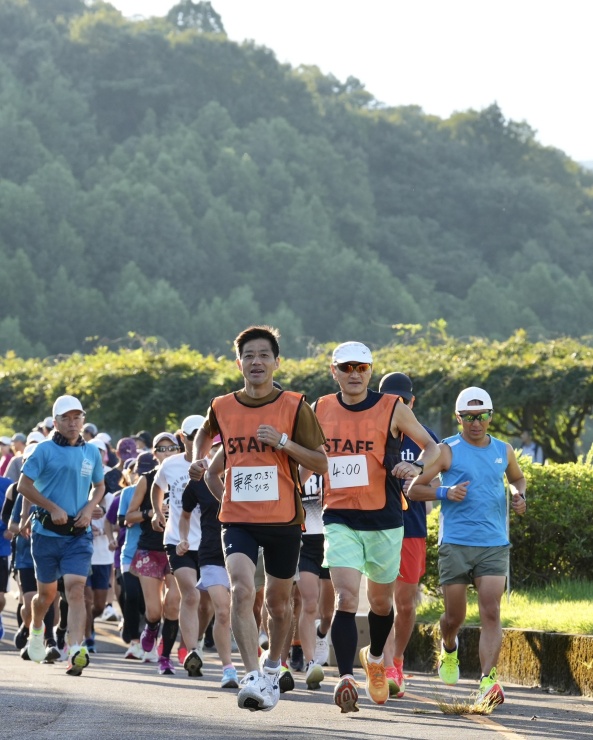 7:00~コース説明、各ペーサーの紹介。各チーム毎に分かれペース、給水ポイントなど事前説明を行いスタートします。