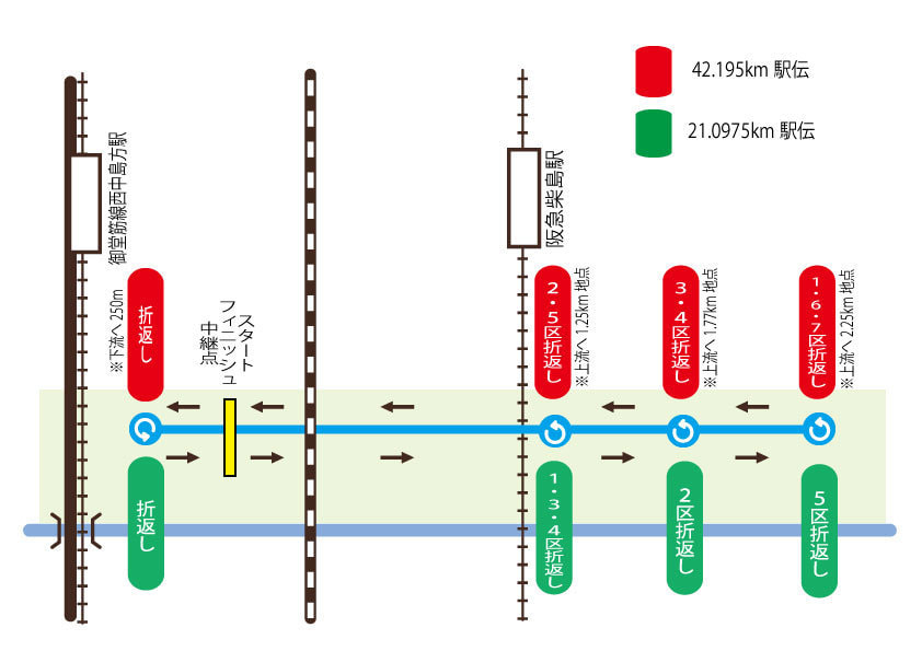 淀川を舞台に、高校駅伝と同距離の42.195km/7区間、21.0975km/5区間で繋ぐ駅伝を開催します!
