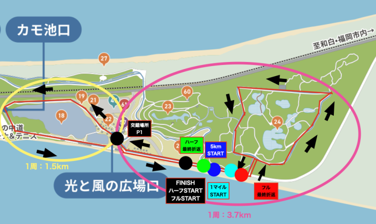 全長5.2kmの周回コース。1周につき2か所の給水地点を用意。全てに水分を、1箇所にジェルを完備。