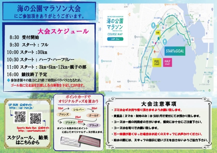 - 受付開始(受付場所 海の公園内・芝口休憩所) ~各種目スタート30分前まで 大会説明:各種目スタート20分前