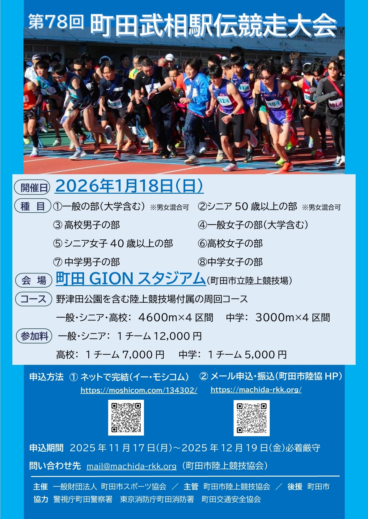 町田GIONスタジアムを含む野津田公園と近隣の一般道を走る、歴史のある駅伝大会です。中学、高校、一般、シニアの部があり、1チーム4名で参加できます(補欠は最大2名)。全4区間で1区間「中学:3km」、「一般、シニア、高校:4.6km」です。町田ならではの起伏の多いコースです。