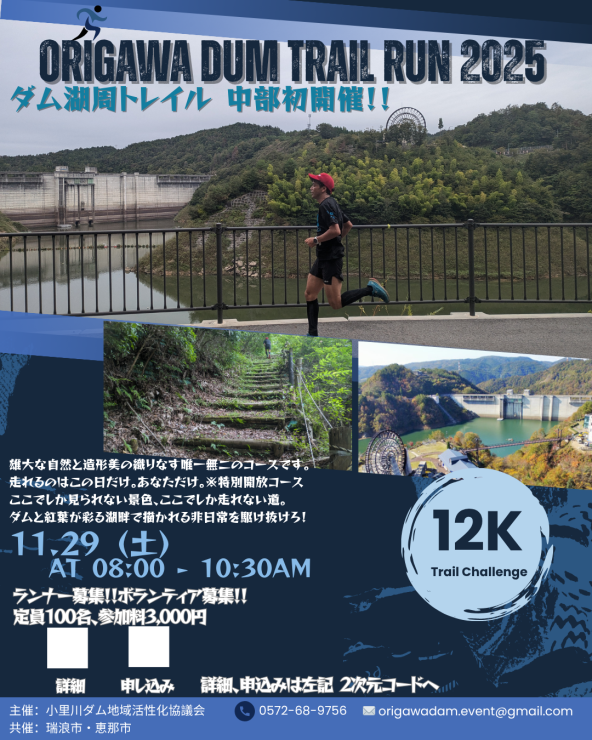 中部地方初開催!小里川ダム(高さ114m)を舞台に、自然と造形美あふれるダム湖周を駆け抜ける特別なトレイルラン。ダム周遊路に加えて、テクニカルなトレイルを含んだ、バリエーション豊かな走り応えあるレース(累積標高約400m)です。