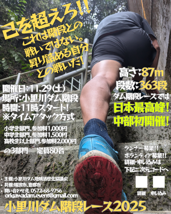 中部地方初開催!岐阜県瑞浪市・恵那市に位置する小里川ダム(高さ114m)を舞台に、特別開放されたダム階段(高さ87m・363段)を駆け上がるタイムトライアルレース。己との闘いに挑む“階段頂上決戦”です。