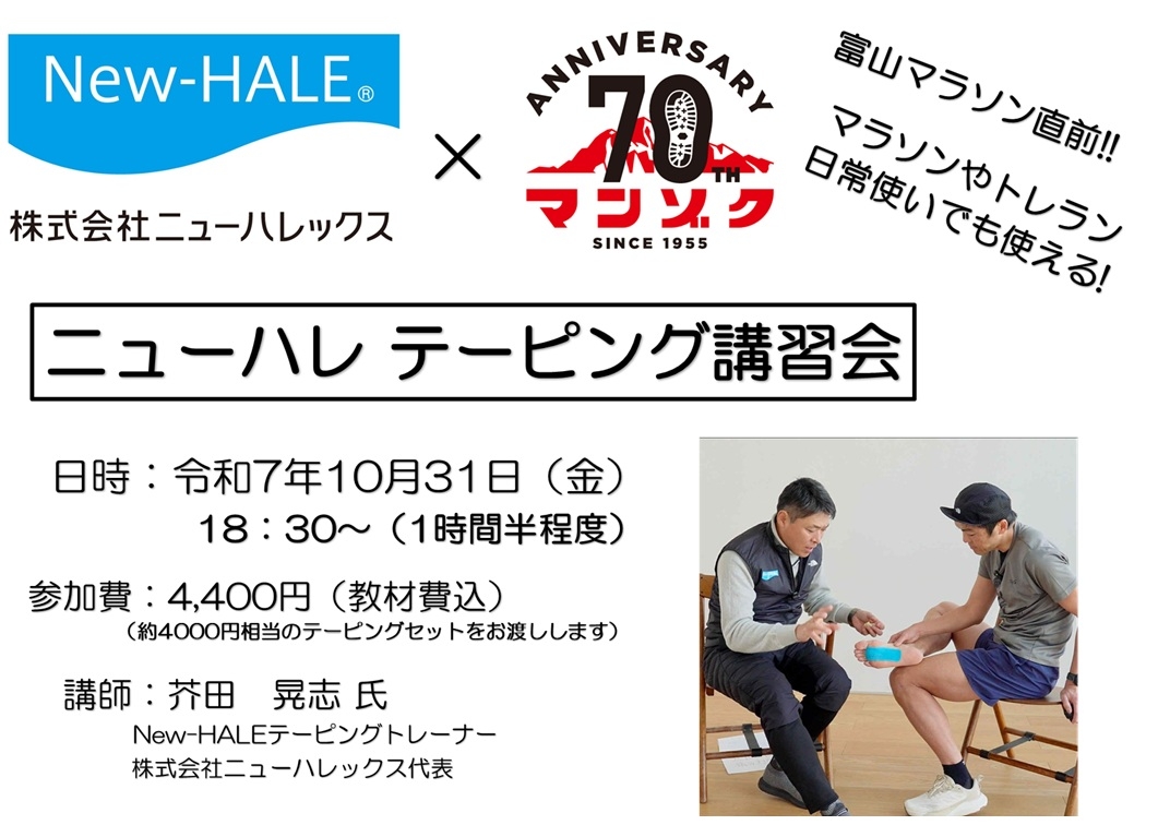 多くのトレイルランナーやクライマーをサポートする粘着性伸縮包帯というカテゴリーの創造の先駆者『New-HALEテーピング』より、トレーナーであり会社代表の芥田晃志氏を2年ぶりにお迎えして登山やトレイルランニング、クライミングなどあらゆるスポーツシーンで役立つテーピング講習会を開催いたします!