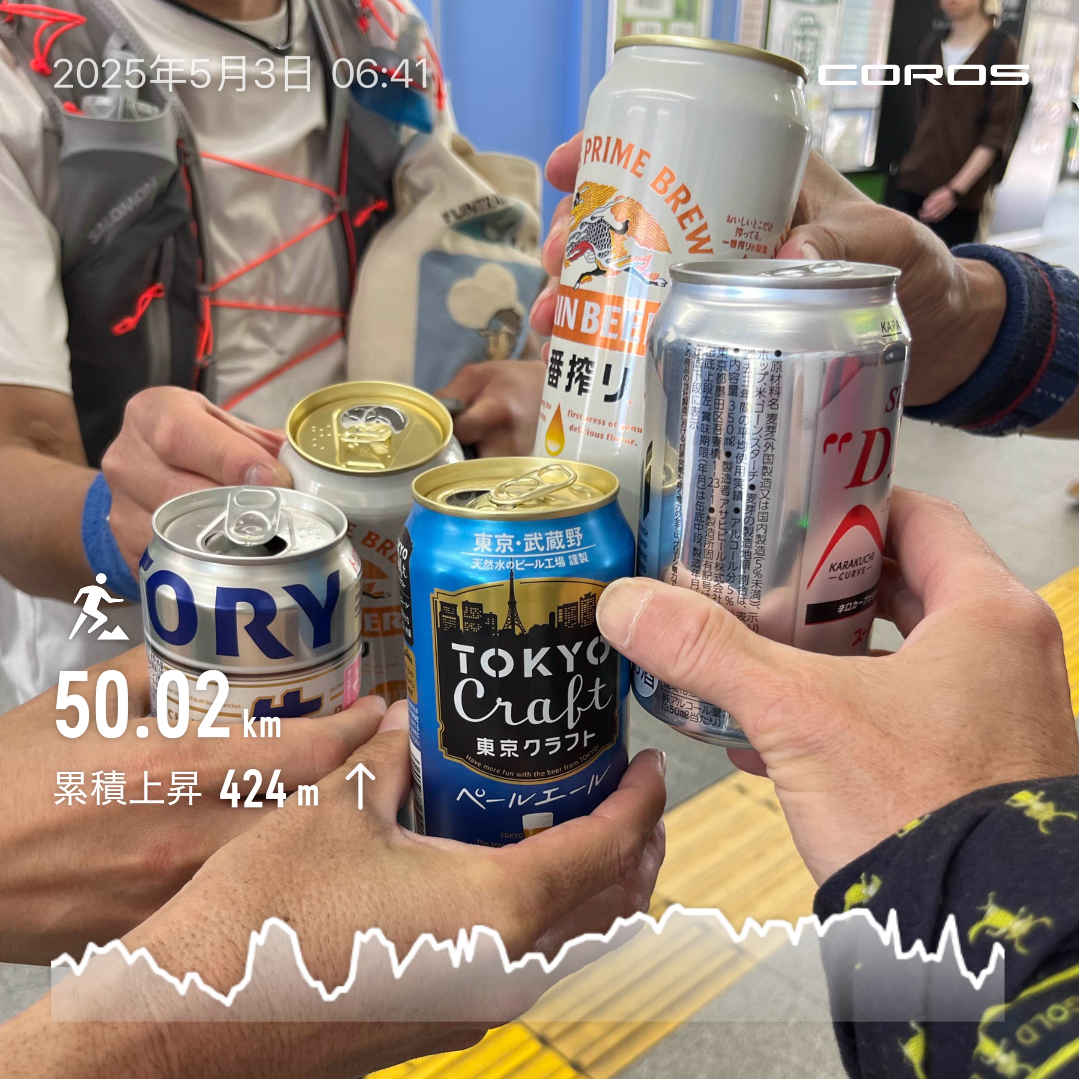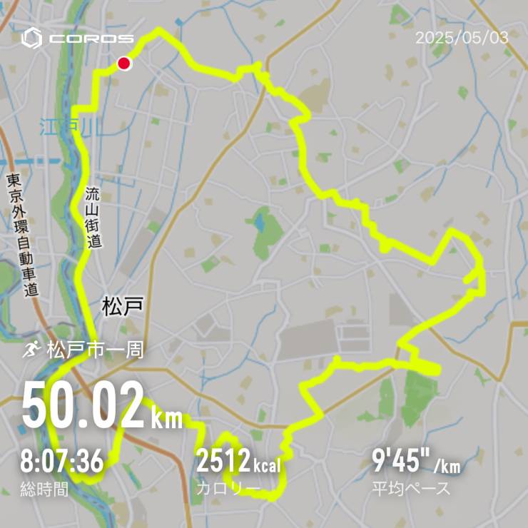 キロペース7〜8でコンビニで休憩と食事をとりながらゆっくりマラニックペースで走ります。