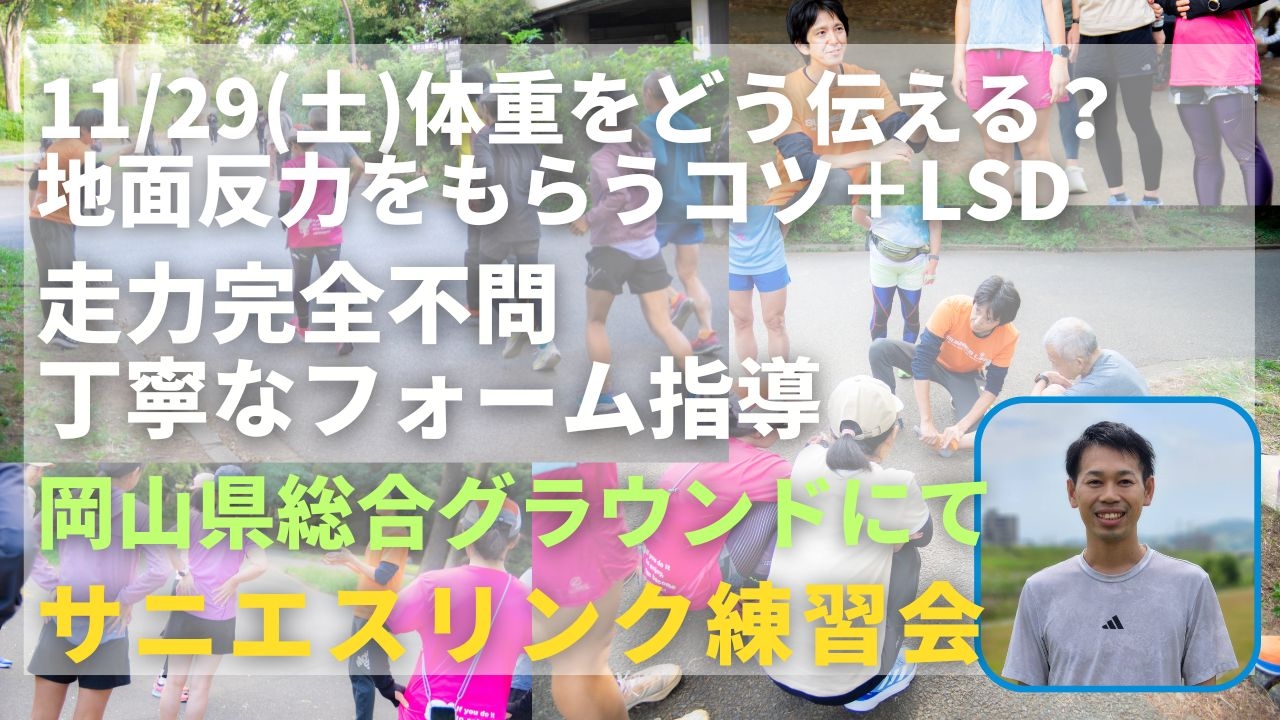 関東ですでに実績のある走力完全不問のランニングクラブ、サニエスリンクです。安心の練習システム、身体の仕組みをうまく使った専門的なストレッチやエクササイズ、丁寧なフォーム指導に定評があります。今まで関東エリアをメインに練習会を運営していましたが、2025年9月より、岡山県総合グラウンドでも練習会を新規スタートしました!ぜひご参加ください!