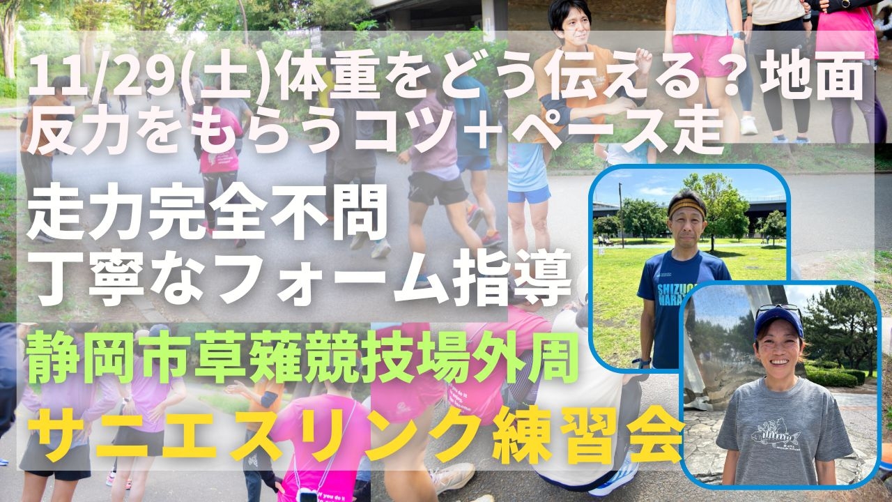関東ですでに実績のある走力完全不問のランニングクラブ、サニエスリンクです。安心の練習システム、身体の仕組みをうまく使った専門的なストレッチやエクササイズ、丁寧なフォーム指導に定評があります。今まで関東エリアをメインに練習会を運営していましたが、2025年9月より、静岡市草薙陸上競技場外周でも練習会を新規スタートしました!ぜひご参加ください!