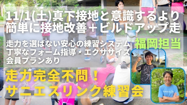 関東ですでに実績のある走力完全不問のランニングクラブ、サニエスリンクです。安心の練習システム、身体の仕組みをうまく使った専門的なストレッチやエクササイズ、丁寧なフォーム指導に定評があります。今まで関東エリアをメインに練習会を運営していましたが、2025年9月より、福岡市大濠公園でも練習会を新規スタートしました!ぜひご参加ください!