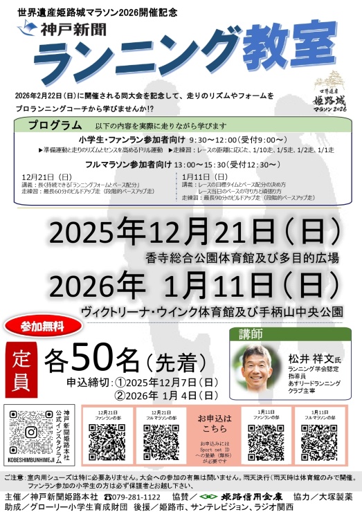2026年2月22日(日)に開催される、「世界遺産姫路城マラソン2026」の開催を記念して、ランニング教室を開催します。