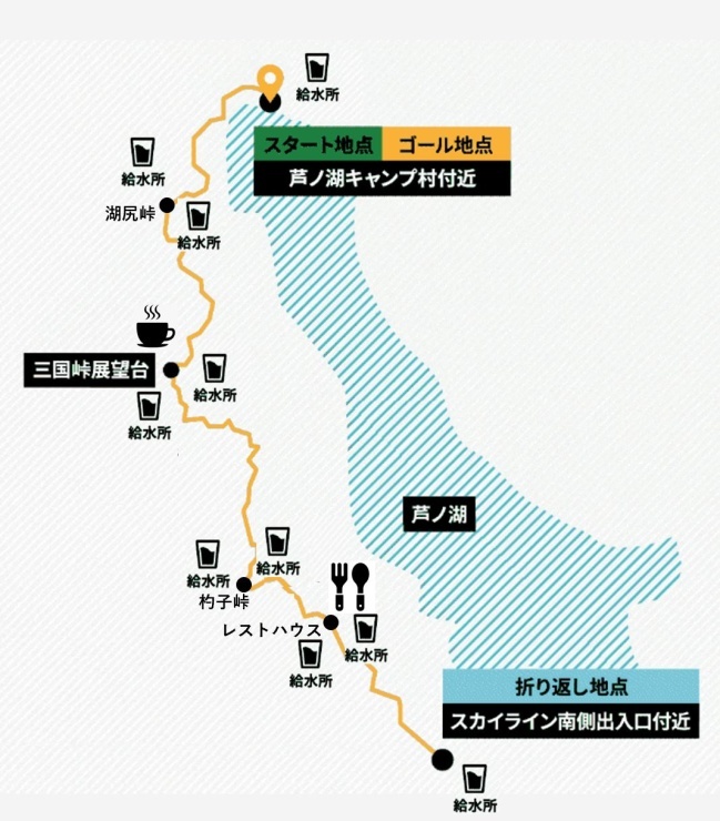 芦ノ湖キャンプ村をスタートし、芦ノ湖スカイライン南側出入口を折り返す全長約22㎞のハーフファンラン。