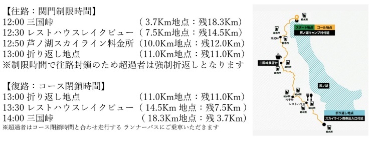 以下の制限時間で往路の関門を封鎖させて頂きますので、ご自身の走力を踏まえて余裕を持ったスタートやタイム管理をしてお楽しみください。