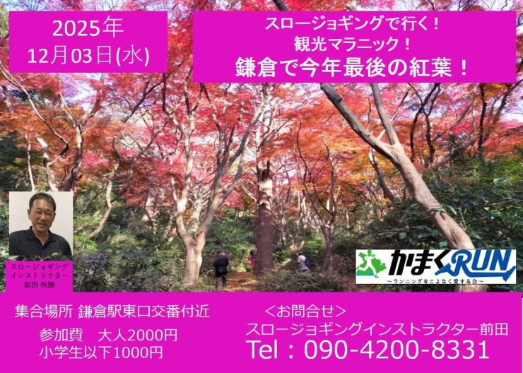 鎌倉の紅葉の見頃は、例年11月下旬から12月上旬です。気温が低い年には10月下旬ごろから葉が色づき始め、赤や黄色に色づいていきます。鎌倉は関東で最後に紅葉の見頃を迎える地域で、神社仏閣の境内などで紅葉狩りを楽しむことができます。急な上り坂はウォーキングで、また天園ハイキングコースもすべて歩きます。無理をしないのがスロージョギングですので、すべて歩いても構いません。