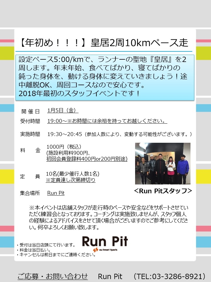 設定ペース5:00/kmで、年末年始でなまった体を取り戻していきましょう!途中離脱OK、周回コースなので安心です。2018年最初のスタッフイベントです!