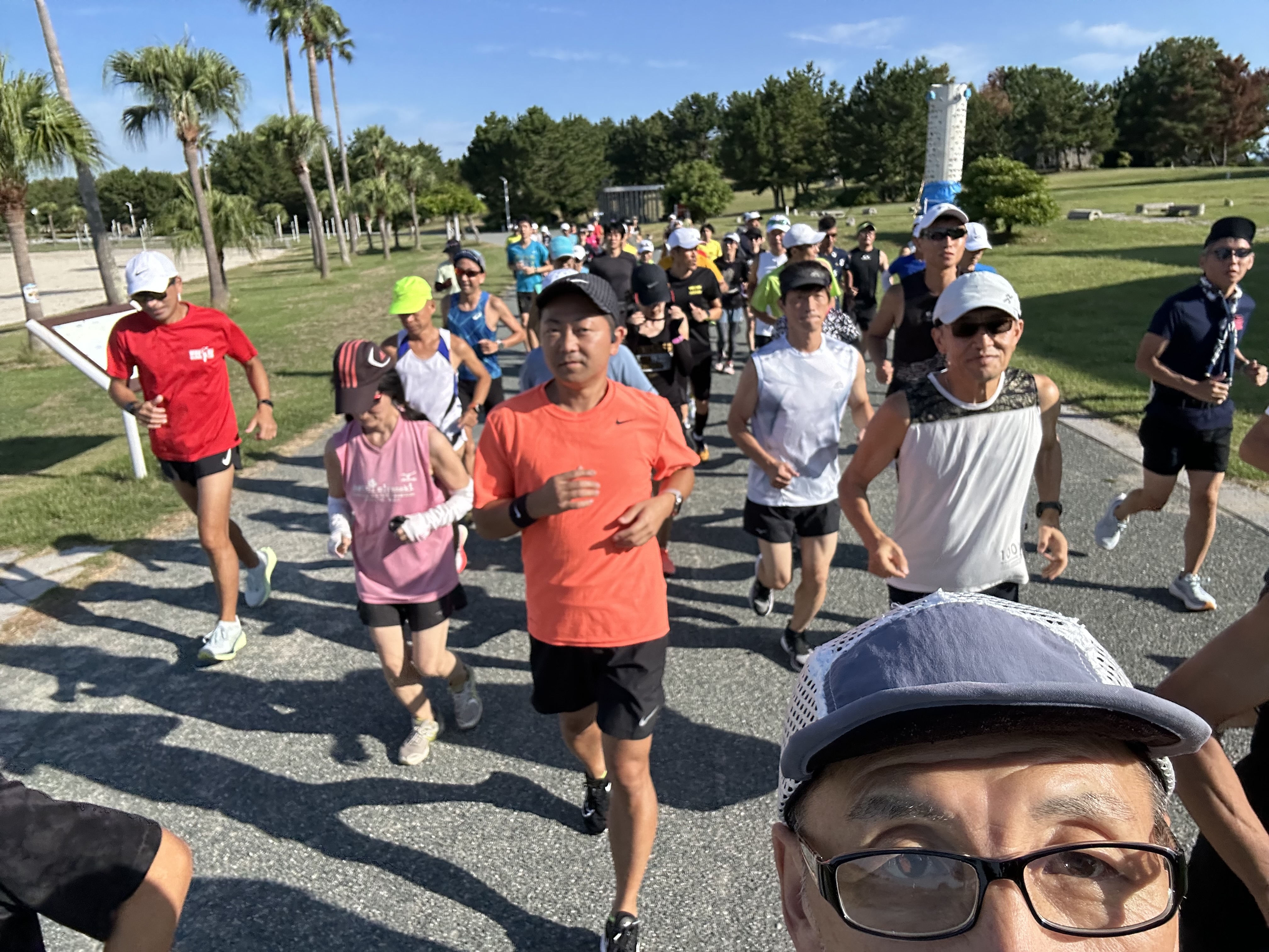 - コース確認兼アップのため全員で1周ラン。 注1)この1周を30kmに換算するか否かは個人の判断で。 注2)第1スタートの組は1周ラン後、一息入れたら直ぐにスタートします。