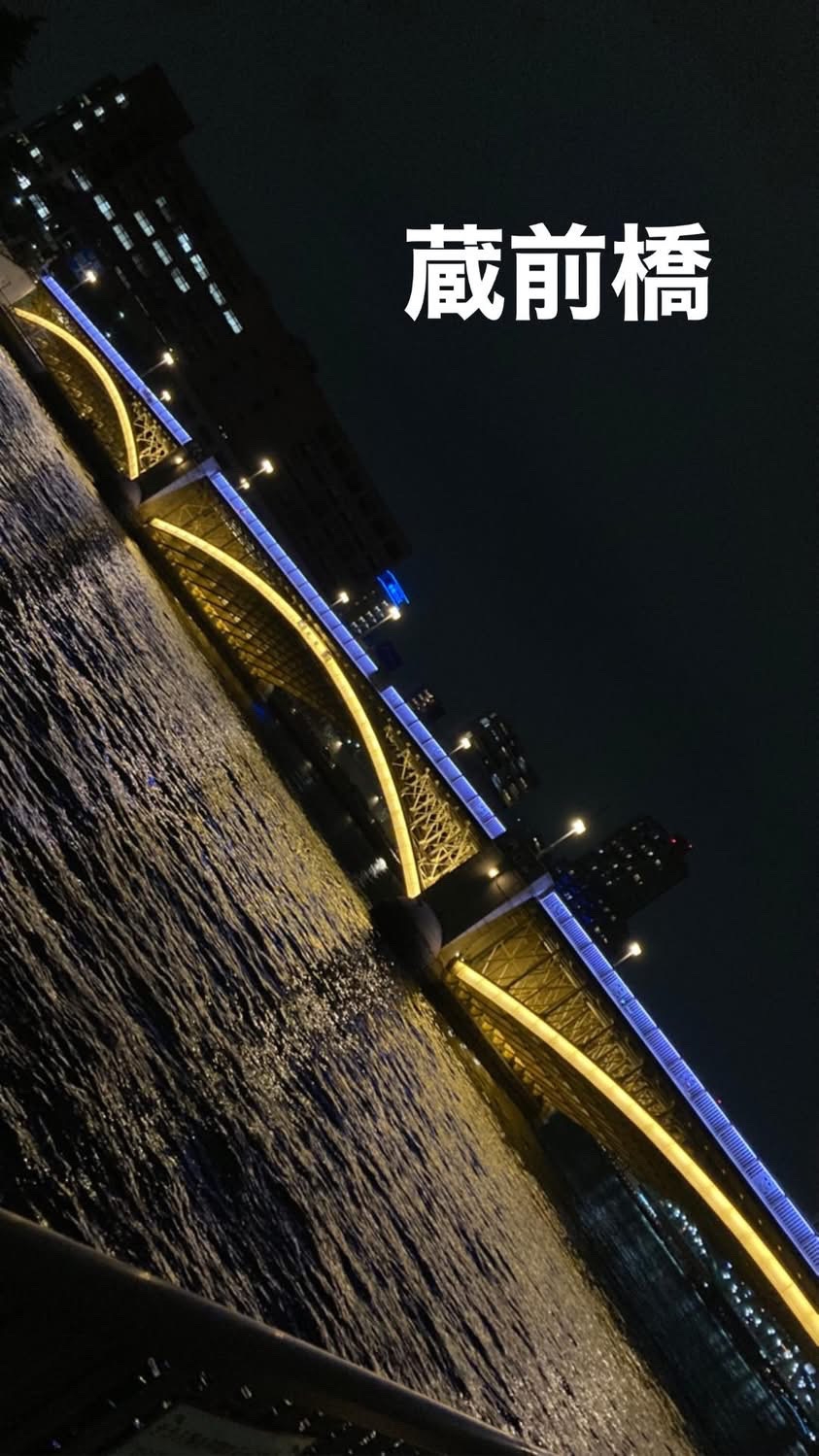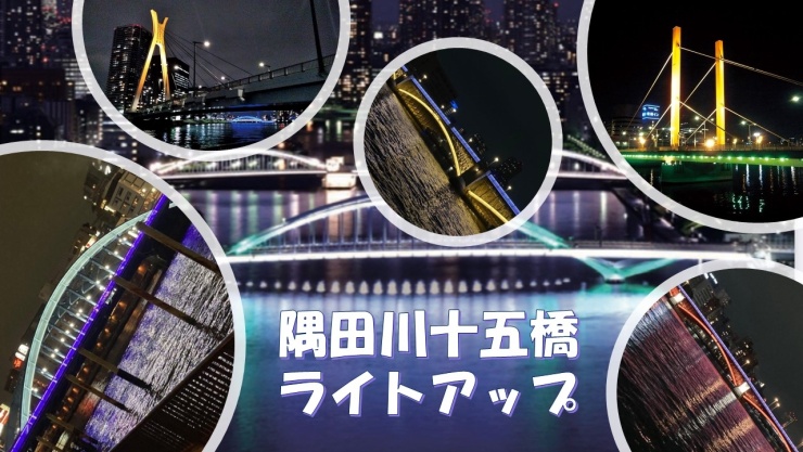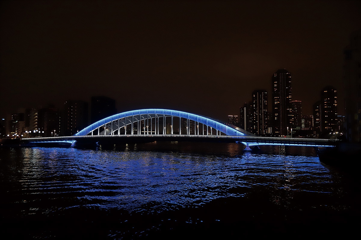 令和2年ライトアップを新設した6橋「築地大橋」「佃大橋」「蔵前橋」「厩橋」「駒形橋」「白鬚橋」、リニューアルした4橋「勝鬨橋」「永代橋」「清洲橋」「吾妻橋」、整備済みの2橋「中央大橋」「新大橋」の12 の橋のライトアップで、隅田川沿いの水辺ににぎわいを創りだしています。