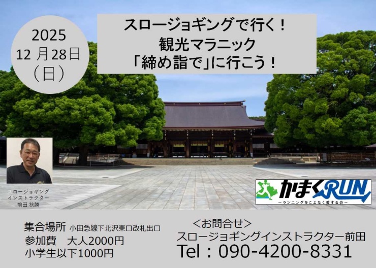 初詣では例年の参拝者数が全国1位となっている明治神宮へと1年最後の「締め詣で」を行います。また「来年もよろしくお願いします」の意味も含めスロージョギングで行きます。急な上り坂はウォーキングで平坦な道はスロージョギングで進みます。
