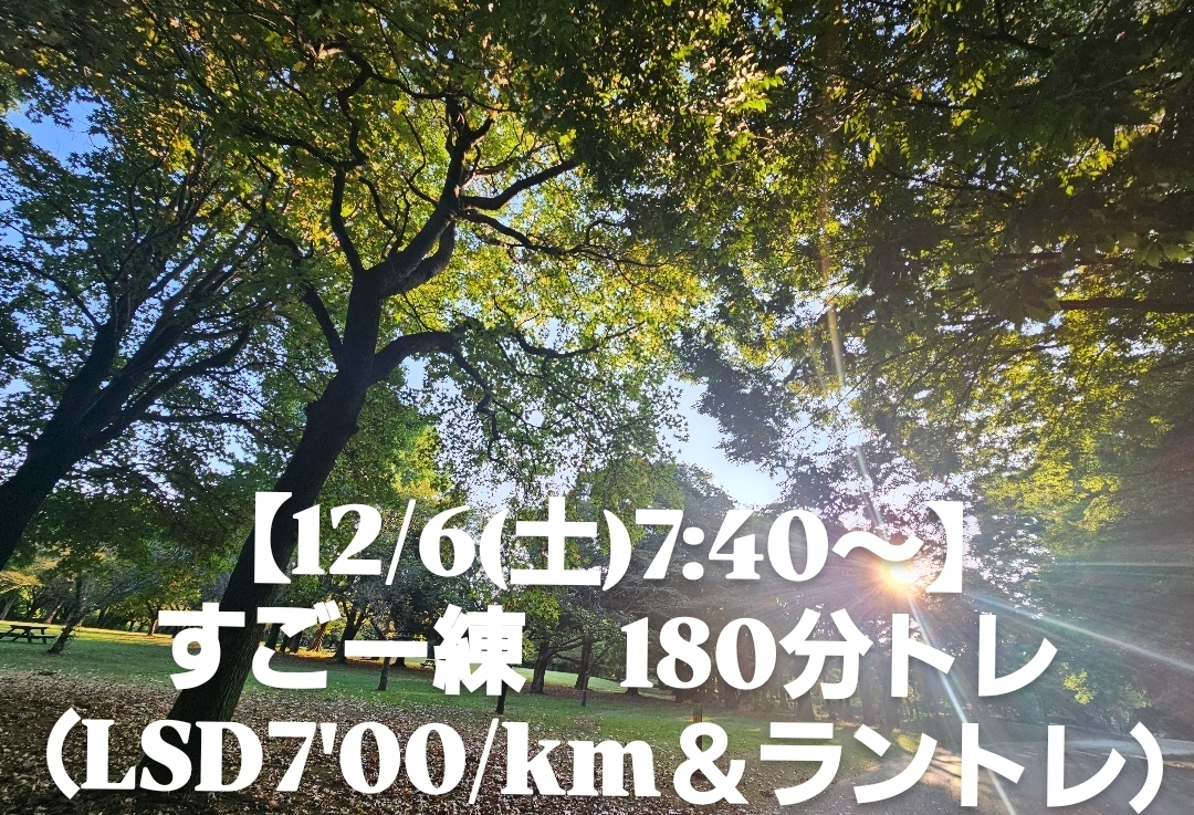- 【12/6(土)7:40~】すごー練180分トレ(LSD7'00/km&ラントレ) :