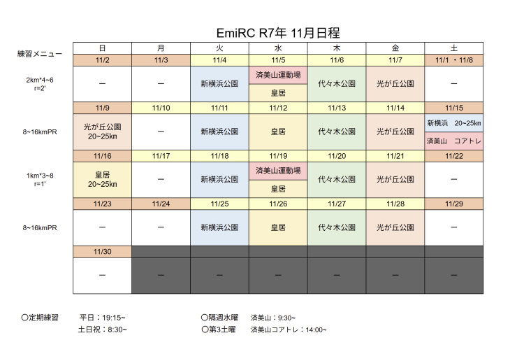 - 11/25(火) 8~16kmPR 動き作り有り :
