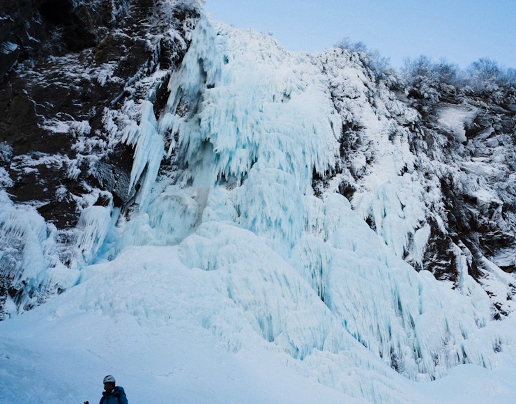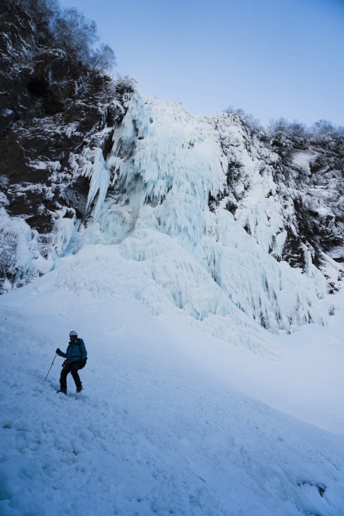 落差95m 、それ自体が御神体でもある「不動滝」の完全結氷した姿を間近で望むことができるガイドツアーです。