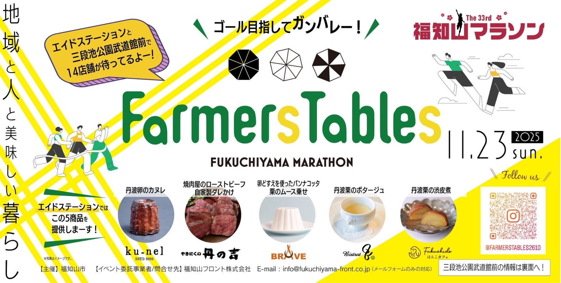 昨年大好評だった福知山の旬を体感できる食のイベント「Farmers Tables」のエイドステーションを今年はさらにパワーアップ!昨年の倍以上の数をご用意しています。