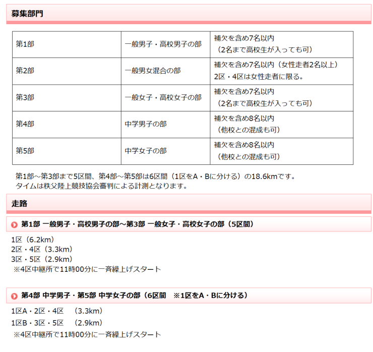 秩父ミューズパーク内で周回する全5区間(中学生は6区間)のたすきリレー。1周6.2kmを3周、計18.6kmを一般・高校生は5人、中学生は6人で襷を繋ぐ。