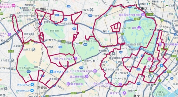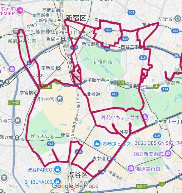 前半、顔のみのコース21kmを描き、代々木駅に戻ります。