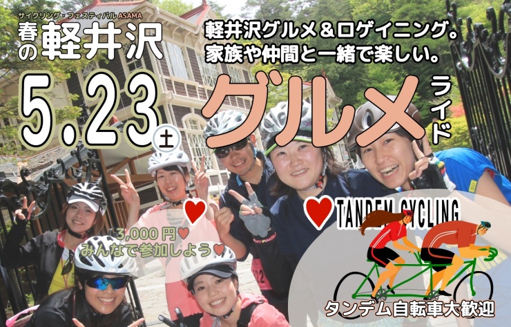 軽井沢からスタートする本格山岳グランフォンドをメインイベントに、軽井沢のグルメを自転車で巡り、タンデム車で公道ツーリングを楽しむ<グルメフォンド軽井沢>も人気です。