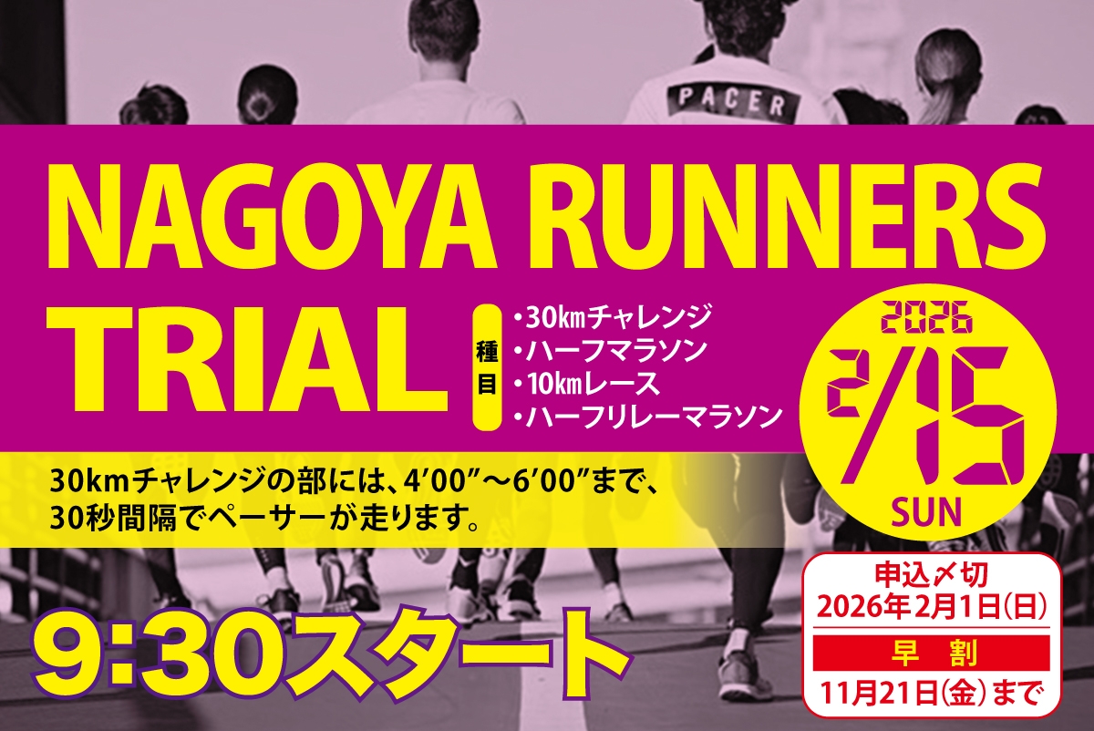 2026年2月15日(日)「NAGOYA RUNNERS TRIAL」を庄内緑地公園にて開催。30km・ハーフ・10km・リレーを実施し、30kmには4’00~6’00の30秒刻みでペーサーを配置。フラットな周回コースで、冬期の走力確認やフル本番に向けた調整に最適です。※11/20まで早割受付中。