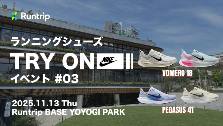 Runtrip BASE YOYOGI PARKを拠点にNIKEの最新ランニングシューズをTry onできる体験イベント。NIKEのシューズの魅力や履きわけ方を体感いただける機会提供します。