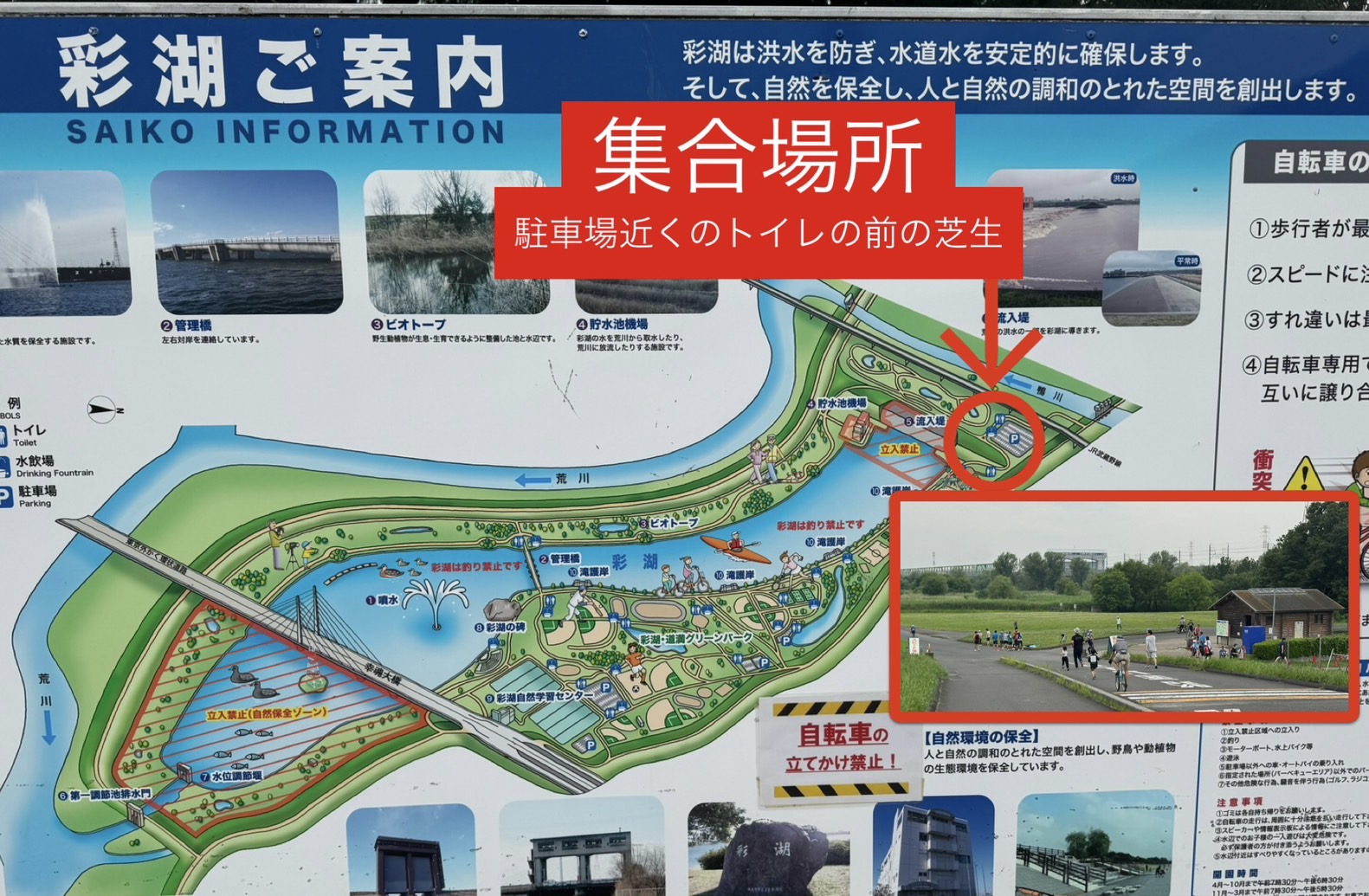 「荒川彩湖公園駐車場」近くのトイレの前の芝生が集合場所です。地図の赤い丸を付けた場所です。