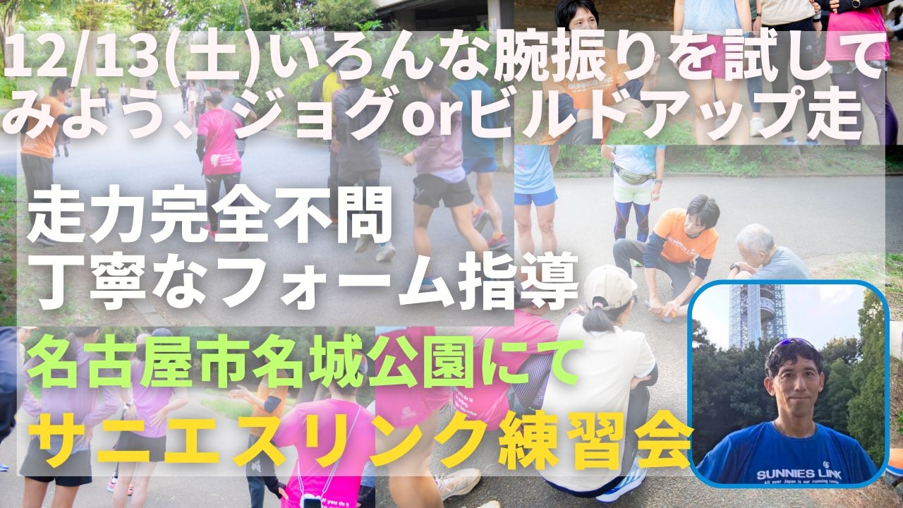 関東ですでに実績のある走力完全不問のランニングクラブ、サニエスリンクです。安心の練習システム、身体の仕組みをうまく使った専門的なストレッチやエクササイズ、丁寧なフォーム指導に定評があります。今まで関東エリアをメインに練習会を運営していましたが、2025年11月より、名古屋市名城公園でも練習会を新規スタートしました!ぜひご参加ください!