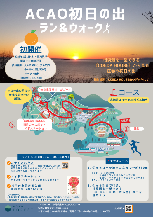 熱海の「ACAO FOREST」内にある相模灘を一望できる「COEDA HOUSE」にて入園前の特別な時間に初日の出を見るラン&ウォークイベントです!!