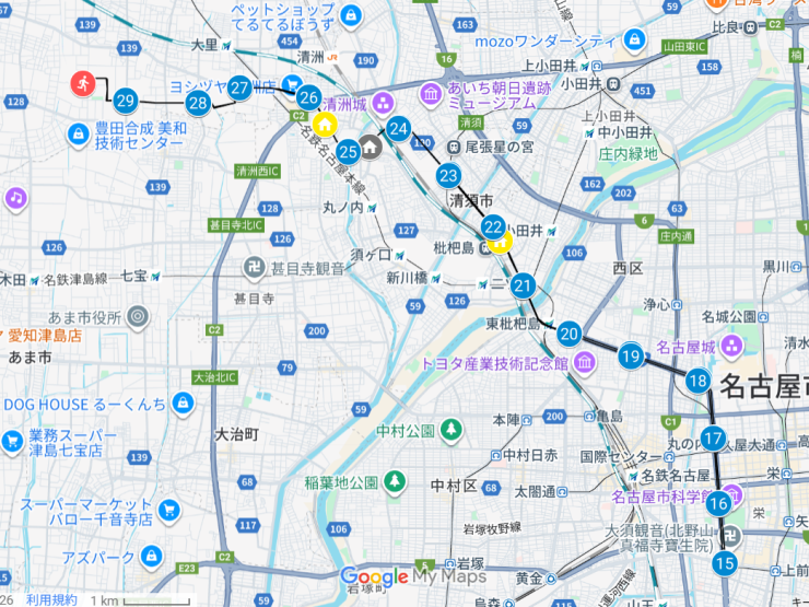 稲沢ぽかぽか温泉から大須観音までの往復30km走になります
