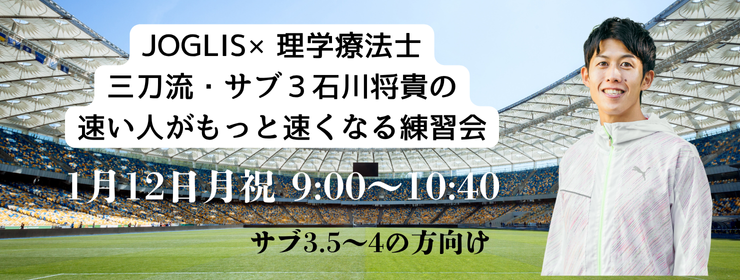 1月12日月・祝「三刀流・サブ3石川将貴の速い人がもっと速くなる練習会」サブ3.5~4の方向け 受付中