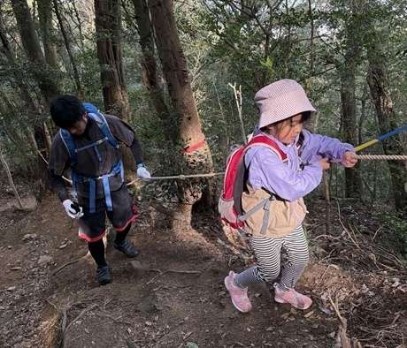 ⑤ロープを使って登るポイントで子ども達大興奮