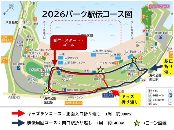 申し込み時点に想定したキッズコース、駅伝コースはそれぞれ1km、1.6kmをこえていましたので修正しました。このホームページの最初の画像をご参照ください。なお柴口駅前、正面入口、南口入口、ビーチ前はタイル状の敷石のため転ばないように十分注意してください。