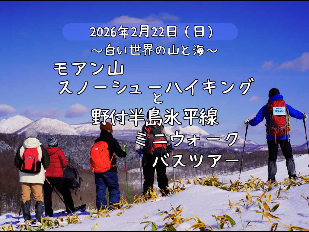 中標津と周辺の自然を肌と味覚で感じられるモアン山スノーシューハイキングと野付半島氷平線ミニウォークバスツアーを実施します。モアン山は標高約356m、なだらかな山なので初心者でも登りやすい山です。当日は南知床山岳会の皆さんが同行します。モアン山のお天気が良ければ、てっぺんからは白く広大な大地が見下ろすことができます。
