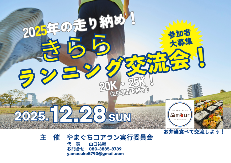 ファンランで楽しく20〜25kを走り、ラン後はみんなでお弁当を食べて交流会。一年を楽しく締めくくり、来年に繋げていきませんか?