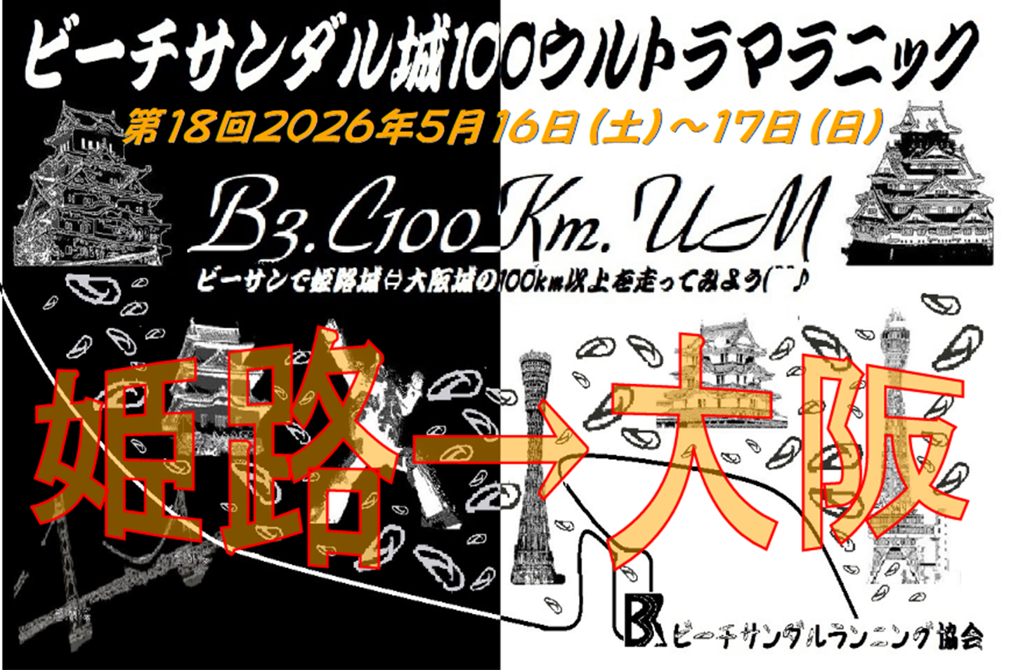 姫路城と大阪城の間、約100Kmをビーチサンダルでランニングします。