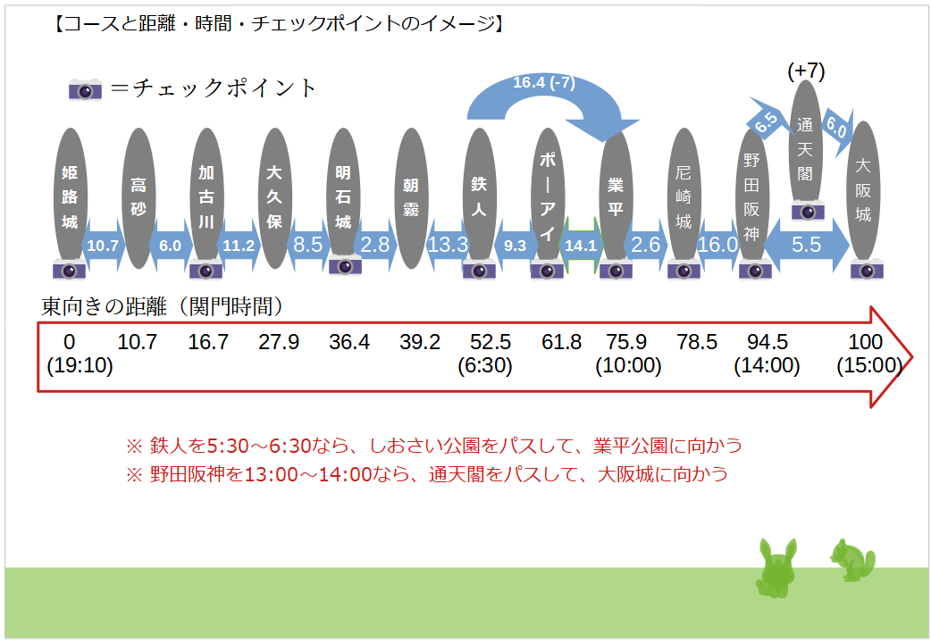 大阪城と姫路城の間は、最短で約92Kmですが、皆さんが胸を張って「100Km走ったぞー!」と言えるように、距離調整のチェックポイントを設けています