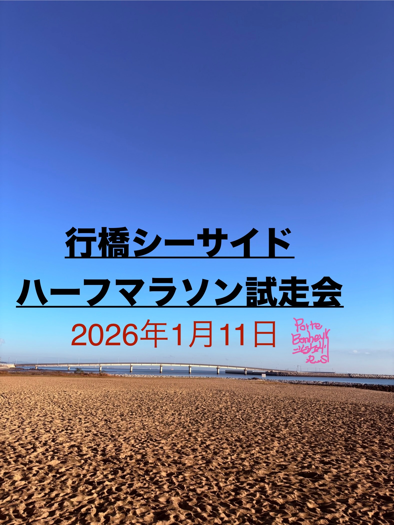 2026年1月開催の行橋シーサイドハーフマラソンの試走会です。レース前のアップやランニングに必要なドリルを行った後、比較的変化のある前半5k、後半5kのコースを走ります。1K7分程度のペースでゆったり走ります。折り返し地点に簡易的な給水、補給職用意致します。参加者は12月、1月の毎週金曜日18時30分、行橋総合公園での練習会に参加できます。直接主催者へお問い合わせください。