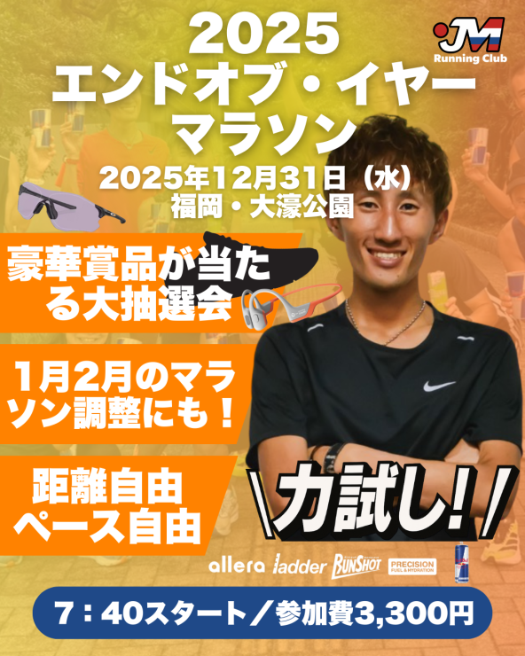 12/31大濠公園で走り納め!JM Running Club主催イベント。サブエガ~サブ4まで。1・2月のレースに向けた実戦練習しませんか?距離調整は自由!ガチ練もファンランもOKです。終了後はシューズやサングラス、骨伝導イヤホンなど豪華賞品が当たる大抽選会あり!2025年の締めくくりにぜひご参加ください。